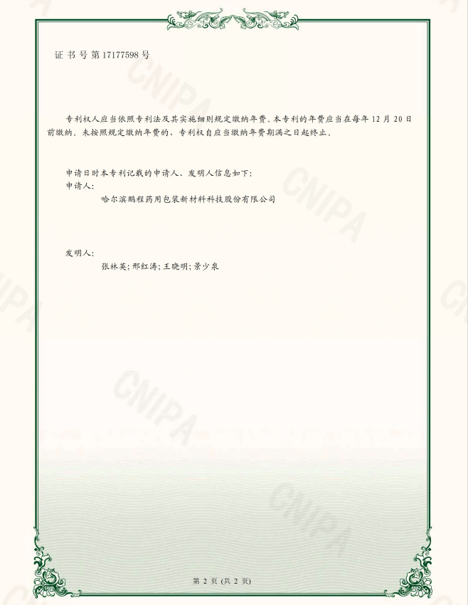 專利 權(quán)人:哈爾濱鵬程新材料科技股份有限公司