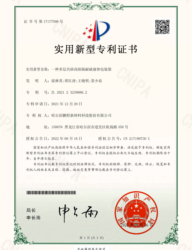 實(shí)用新型名稱:一種多層共擠高阻隔耐破液體包裝袋